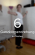 Übung 6 - Ganzkörperdrehung: Im Stehen den Körper nach links und rechts drehen. Der Blick folgt dem Daumen bei ausgestrecktem Arm. Eine Hand stützt dabei an der Wand. Wichtig ist, nicht zurücklehnen, vorne bleiben, 30 Sekunden - zwei Durchgänge.