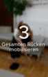 Übung 3 - Gesamten Rückenmobilisieren: Mit der Schulter zum gegenüberliegenden Knie beugen, dann aufrichten und nach hinten drehen. Der Arm ist ausgestreckt, und der Blick folgt dem Daumen, 30 Sekunden jede Seite - zwei Durchgänge.